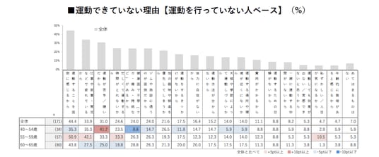 - 運動を行っていない人のできていない理由としては「運動することを面倒に感じるから」(44%)「仕事や家事・育児などで疲れているから」(34%)「運動が苦手・嫌いだから」(31%)など、心理的・時間的要因が挙げられた。