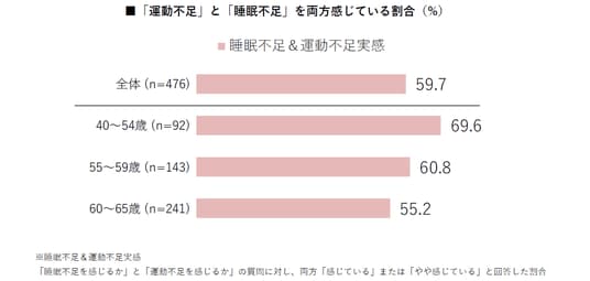 - 「運動不足」と「睡眠不足」を両方感じている人は全体の60%。40~54歳は70%にのぼる。
