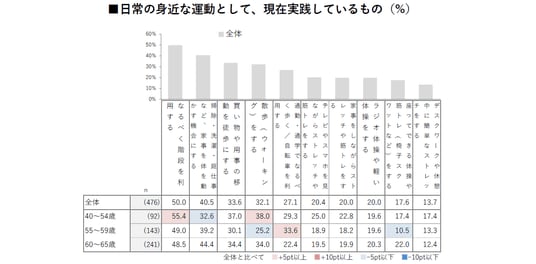 - 日常の身近な運動として実践しているものは「なるべく階段を利用する」(50%)「家事を体を動かす機会にする」(41%)「買い物や用事の移動を徒歩にする」(34%)などが挙げられた。