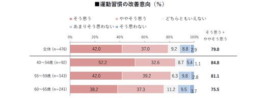 - 80%が「運動不足を感じている」と回答しており、若い年代ほど多い傾向にある。
