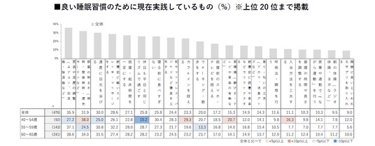 - 良い睡眠習慣のために実践している事は、「室温や湿度の調整」(36%)「部屋の明るさ」(32%)といった就寝時の空調や調光環境を整えることや、「適度に日光を浴びる」(30%)といった生活リズムを整えることが上位に挙げられている。