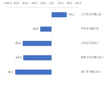 特定の担当者がいると回答した人に対し、コンタクトセンターと担当者は問い合わせ内容の引継ぎや自分の都合の良いタイミングでの連絡があるなどの連携がとれていると感じるか調査したところ、「とてもそう感じる」と回答した人は21.4%、「ややそう感じる」と回答した人は36.4%となりました。これらの回答別にNPSも分析したところ、「とてもそう感じる」と回答した人のNPSは34.3となり、他の回答者に比べても特に高くなりました。コンタクトセンターと担当者間で連携し、利用者をサポートしていくことの重要性が示唆される結果となりました。