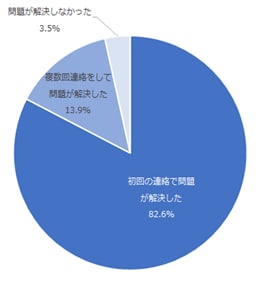問い合わせした内容について、解決までにかかった連絡回数を調査したところ、「初回の連絡で問題が解決した」と回答した利用者が82.6%となりました。また、NPSも分析したところ、「初回の連絡で問題が解決した」と回答した利用者のNPSは-30.7となり、「複数回連絡をして問題が解決した」、「問題が解決しなかった」と回答した利用者に比べてNPSは高くなりました。