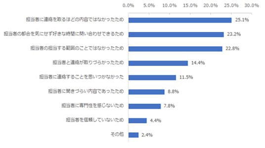 「特定の担当者はいるが、カスタマーサポートに問い合わせをする前に相談をしなかった」と回答した人に対し、担当者に連絡をしなかった理由を調査したところ、「担当者に連絡を取るほどの内容ではなかったため」(25.1%)が最も高く、次いで「担当者の都合を気にせず好きな時間に問い合わせできるため」(23.2%)、「担当者の担当する範囲のことではなかったため」(22.8%)が続きました。