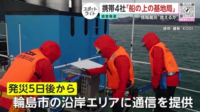 発災5日後から、輪島市の沿岸エリアに通信を提供。当時はNTTグループとKDDIの2社による合同プロジェクトだったが、今ではソフトバンクと楽天モバイルも加わり、携帯大手4社の基地局が運ばれることになった。