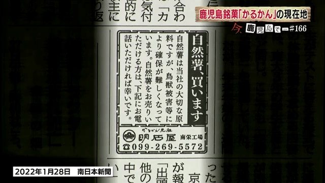 2022年1月、鹿児島の地元紙・南日本新聞に「自然薯、買います」という広告が掲載された。鹿児島を代表する銘菓「かるかん」発祥の老舗和菓子店「明石屋」が出したものだ。