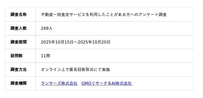本調査は「ランサーズ」および「GMOリサーチ&AI」を通じて、不動産会社が提供する一括査定サービスを利用したことがある方249人を対象に実施したものです。