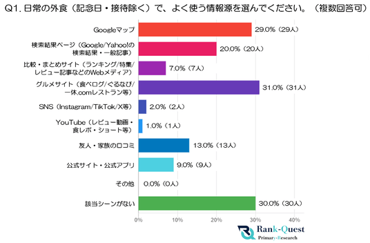 そこで、SEO対策支援実績4,300社を誇るランクエスト(https://rank-quest.jp/column/column/how-to-seo/ )は、40代男女100名を対象にアンケートを実施しました。日常利用の情報源やグルメサイトの使い分け、来店の決め手となる要素、検索方法までを多面的に分析し、40代の外食意思決定プロセスを“見える化”しています。