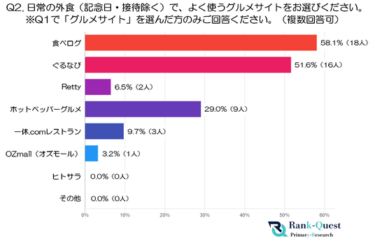 - 一方、「一休.comレストラン」(9.7%・3人)や「Retty」(6.5%・2人)、「OZmall」(3.2%・1人)は、シーンや目的を限定して使い分ける傾向が見られ、主流派とは異なる選び方をしている様子がうかがえます。