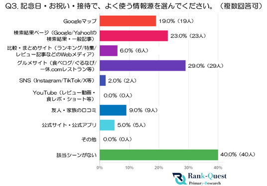- 一方で、「SNS」(2.0%・2人)や「YouTube」(0.0%)の活用はごくわずかで、記念日・接待では“確実性と安心感”を重んじる慎重な情報収集スタイルが際立っています。