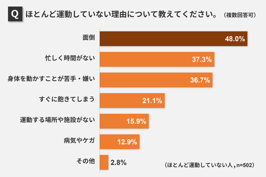 「普段から運動をしていますか?」の質問に対し「ほとんど運動をしていない」と回答した人へ、運動をしていない理由を聞いたところ、回答の多かった順から「面倒」(48.0%)、「忙しく時間がない」(37.3%)、「身体を動かすことが苦手・嫌い」(36.7%)という結果になりました。