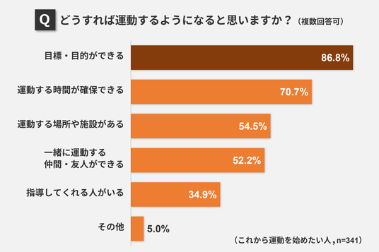 「はい」と回答した人に、どうすれば運動をするようになると思うか質問したところ、最も多かったのは「目標・目的ができる」(86.8%)、続いて「運動する時間が確保できる」(70.7%)、「運動する場所や施設がある」(54.5%)という結果となりました。