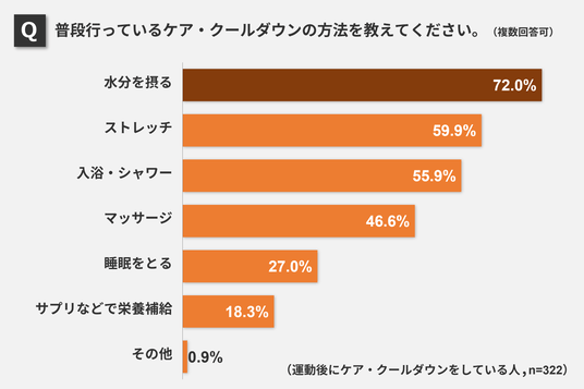 ケア・クールダウンを行っている人にその方法について質問したところ、「水分を摂る」が最も多く、その割合は72.0%でした。以降、「ストレッチ」(59.9%)、「入浴・シャワー」(55.9%)と続いています。