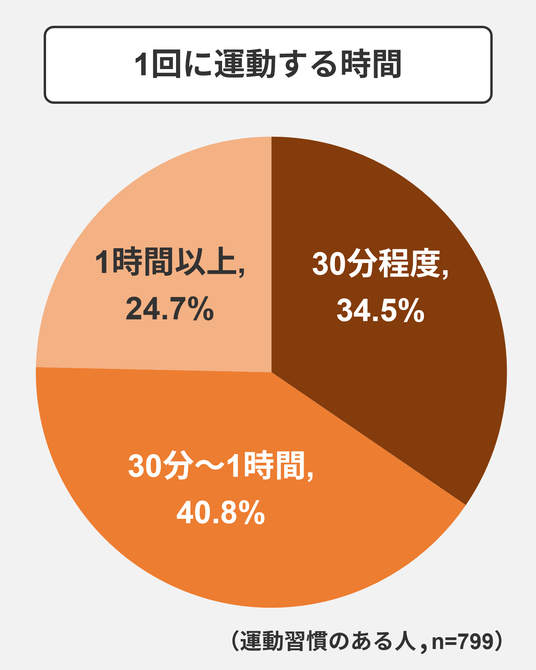 また、普段から運動をしている人に1回に運動する時間について質問したところ、「30分程度」が34.5%、「30分~1時間」が40.8%、「1時間以上」が24.7%と、30分~1時間程度の運動を行っている人が比較的多い結果となりました。