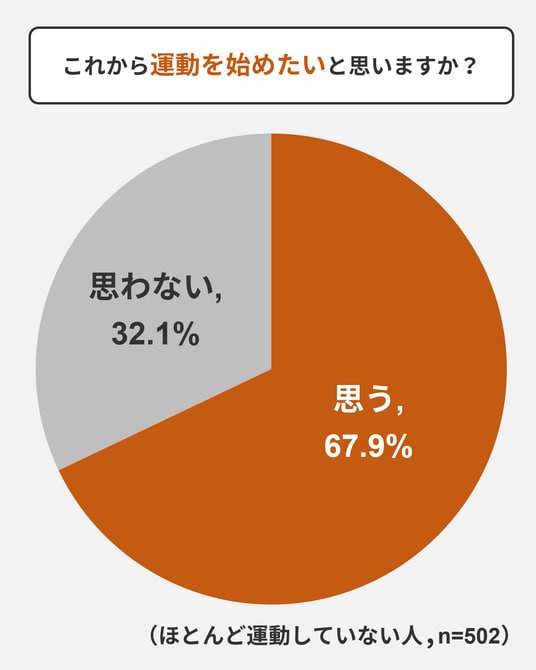 普段ほとんど運動をしていない人に「運動を始めたいと思いますか?」と質問したところ、67.9%が「はい」と回答しました。