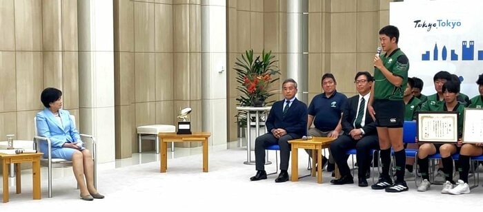 小池知事は「普段頑張ってきたからこそ素晴らしい成果が出せたんだと思います。チームで笑顔で勝ち取ったのはとても良い記憶になります。今回の優勝の思いを活かして、これから勉強にもラグビーにも励んで頂きたい」と述べました。