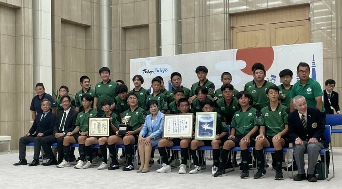 全国中学生ラグビー大会で優勝した世田谷区ラグビースクールが東京都の小池百合子知事を表敬訪問し全国制覇を報告しました。