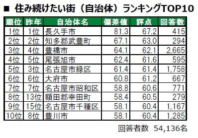 1位は5年連続で長久手市で、唯一偏差値80台の極めて高い評価を得ています。2位は、3年連続で知多郡武豊町です。3位は、昨年4位から一つ順位を上げた豊橋市です。トップ10内では、8位の額田郡幸田町(昨年13位)、9位の名古屋市千種区(昨年15位)が、昨年から順位を上げてトップ10入りしています。