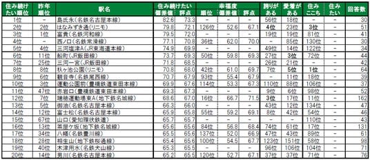 ※駅ランキング:14位熱田は、2021年~2025年の累計回答数が30名未満で、2020年回答を含めても30名に達しなかったため、「住み続けたい」「誇りがある」「愛着がある」の集計対象外となっています。そのため「-」と表記しています。
