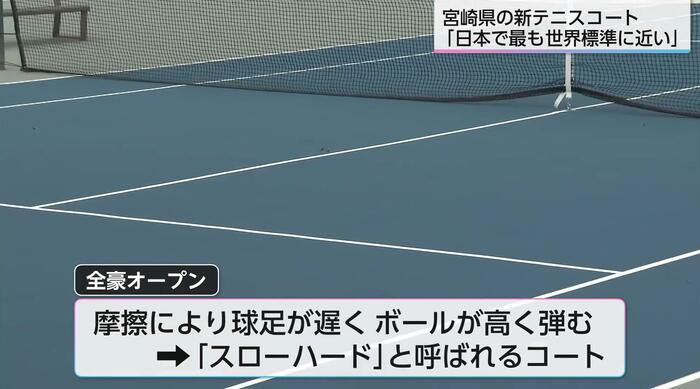 日本テニス協会が「日本で最も世界標準に近いコート」と評価するテニスコートが宮崎に誕生した。球足が遅く、ボールが高く弾む「スローハード」と呼ばれるコートで、10月から一部で利用が開始された。次世代の育成や国際大会開催への期待が高まっている。