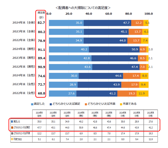 例年、妻の満足度が夫の満足度より低い結果がでていますが、2024年末も同じ傾向が続いています。夫は妻に対して91.1%が満足しているのに対し、妻は夫に対して74.6%程度に留まっています。