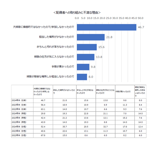 満足した理由は、「きちんと汚れが落ちていたので」が42%でトップ。2位に「積極的に取り組んでくれた」が33.9%となり、大掃除に対して積極的に関わる姿勢に満足されているようです。夫婦間で満足度の乖離はあるものの、妻の満足度は2022年末が68.8%、2023年末には72.7%、今回が74.6%とここ数年微増を続けており、夫への満足度が徐々に高まっている傾向が見て取れます。また、不満の理由は「大掃除に積極的ではなかった/手伝ってくれなかった」がダントツの1位でした。