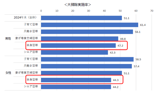 ・既婚/子育て/共働き/専業主婦世帯と比較して、単身世帯は大掃除の実施率は低め単身世帯の掃除の実態としては全ての場所において掃除頻度は低めとなりました。掃除実施率については、男性が、「妻が専業主婦世帯」と同程度の47.2%、女性が「シニア世帯」と同程度の44.3%で、低めの結果となりました。