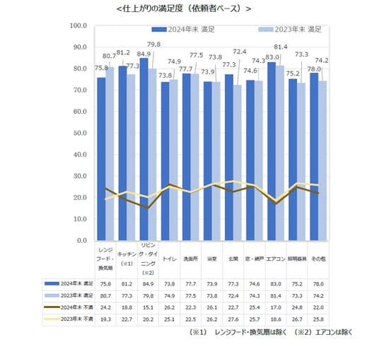 依頼場所でのトップはエアコンの7.5%。2023年の6.7%から微増しており、エアコンを掃除する習慣が高まって来ていると推測できます。その他ではレンジフードやキッチン、浴室など水回りを中心に玄関や窓など、普段掃除がしにくいところをプロに依頼されているようです。満足度はエアコンの83%が高い満足度となりました。全体の満足度でも平均77.7%と高い数値となっております。