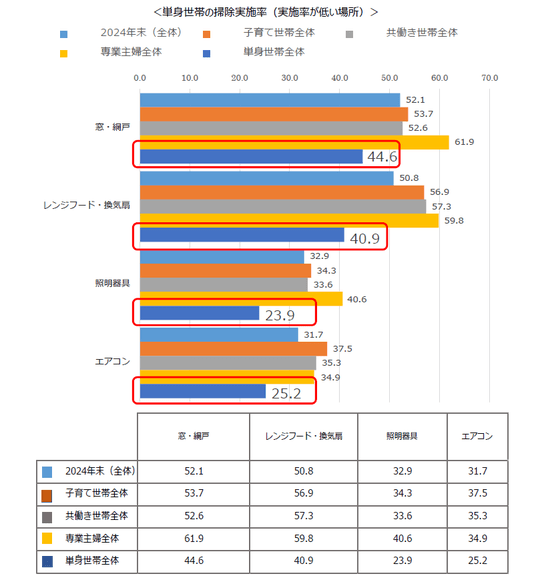 単身世帯では窓やレンジフード、照明器具の実施率が全体よりも低い結果となりました。大掃除の時に掃除する場所を追加する傾向は少なく、普段の掃除の延長として実施している傾向がうかがえます。単身世帯は、家族や同居者の影響や意見が少ないことから自身が納得できる掃除頻度で行っていることがうかがえます。