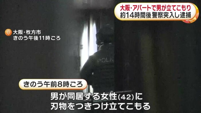 22日、大阪・枚方市のアパートで刃物を持った男が同居する女性を人質に取り、立てこもる事件が起きました。警察は14時間後に突入し、男を逮捕しました。