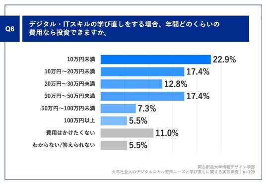 「Q6.デジタル・ITスキルの学び直しをする場合、年間どのくらいの費用なら投資できますか。」(n=109)と質問したところ、「10万円未満」が22.9%、「10万円~20万円未満」が17.4%、「30万円~50万円未満」が17.4%という回答となりました。