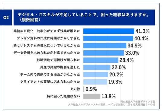 「Q2.デジタル・ITスキルが不足していることで、困った経験はありますか。(複数回答)」(n=109)と質問したところ、「業務の自動化・効率化ができず残業が増えた」が41.3%、「プレゼン資料の作成に時間がかかりすぎた」が40.4%、「新しいシステムの導入についていけなかった」が34.9%という回答となりました。