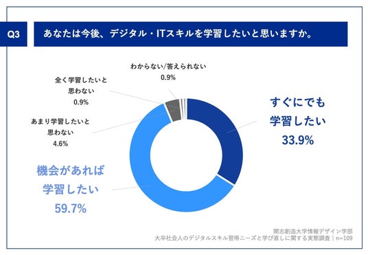 「Q3.あなたは今後、デジタル・ITスキルを学習したいと思いますか。」(n=109)と質問したところ、「すぐにでも学習したい」が33.9%、「機会があれば学習したい」が59.7%という回答となりました。