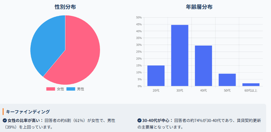 回答者の性別は男性61%・女性39%で、比較的男性が多く、賃貸契約の意思決定を主導する層が中心です。