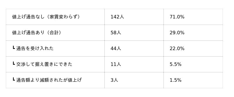 およそ7割が「家賃据え置き」で、値上げを経験した人は3割弱にとどまりました。