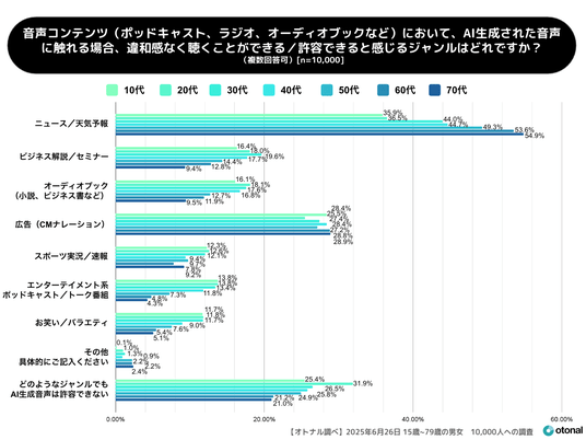 ~全年代が違和感なく聴けるAI生成音声コンテンツはニュース・天気予報が46.9%でトップ。年代間で許容できるジャンルの違いが明らかに~
