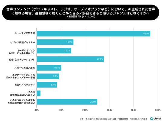 一方で、4人に1人は「どんなジャンルでも許容できない」と回答しており、AI音声への抵抗感がある層も一定数存在します。