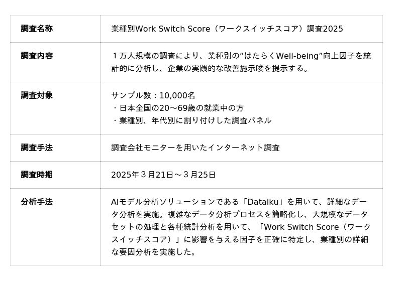 本調査によって、業種別の“はたらくWell-being”の現状・傾向が定量的に示されるとともに、各業種における「Work Switch Score(ワークスイッチスコア)」向上に最も影響する因子を統計的に分析し、“はたらくWell-being”向上につながる可能性のある実践的な改善示唆を公開いたします。
