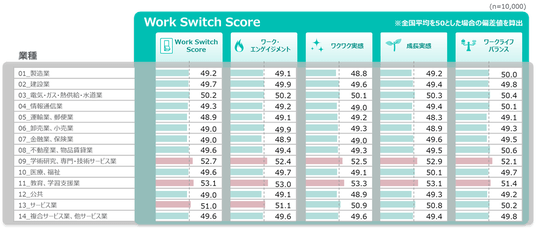 全国10,000名を対象とした本調査の結果、最もスコアが高かったのは「学術研究、専門・技術サービス業」の52.7ポイントで、全体平均(50.0)を大きく上回りました。また、「教育、学習支援業」が全5指標のうち「ワーク・エンゲイジメント」で53.0ポイントと最高値を記録しました。一方、「製造業」(49.2)、「卸売業、小売業」(49.0)、「金融業、保険業」(49.0)などは全国平均を下回る結果となりました。