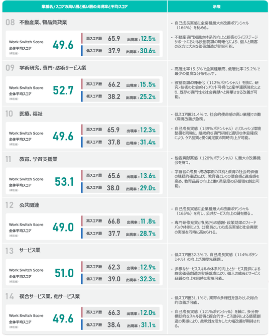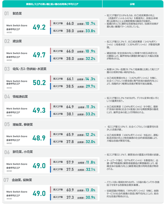2025年実施のWork Switch Score(ワークスイッチスコア)調査(n=10,000)において、業種別の分析を行った結果、業種によって大きなスコア差が存在することが明らかになりました。各業種内での高スコア層と低スコア層を比較することで、業種ごとの改善ポテンシャルと具体的な課題が浮き彫りになりました。本分析では、各業種内でWork Switch Score(ワークスイッチスコア)が高い層と低い層の出現率を算出することで、改善余地を定量化しています。