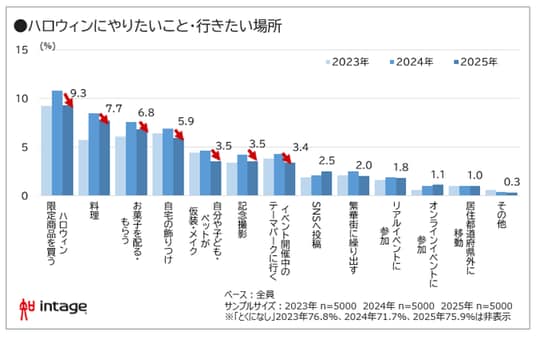 ・「限定商品購入」「料理」「仮装」「お菓子のやりとり」など主要行動が軒並み減少。予定者ベースだと伸びた項目も