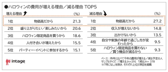では、どのような理由で費用が増減しているのでしょうか。複数選択で確認したところ「物価高」が費用増・費用減両方の理由として最多です。2位以下を見ても、ハロウィン限定商品やイベント参加など、季節ならではの楽しみを求める声もある一方で、収入の伸び悩みや外出控えなども見られました。生活者が“季節イベントを楽しみたい”と“支出を抑えたい”気持ちで揺れている様子がうかがえます(図表2)。