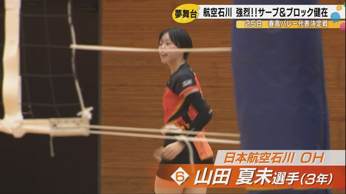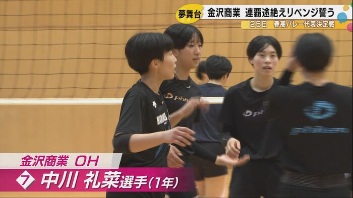 小林由結主将は「サーブで攻めて、ブロックでひっかけて自分たちのカウンターで勝ち進んでいくチーム」と特徴を語る。鋭いサーブに高さを生かしたブロック。去年金沢商業を苦しめたサーブ&ブロックは今年も健在。そしてインターハイ優秀選手でエースの山田夏未選手の攻撃につなげる。山田選手は「エースとして大黒柱でどんなトスも打ち切る役割を担っています。みんなの気持ちを乗せて勝ち切りたい」と話す。