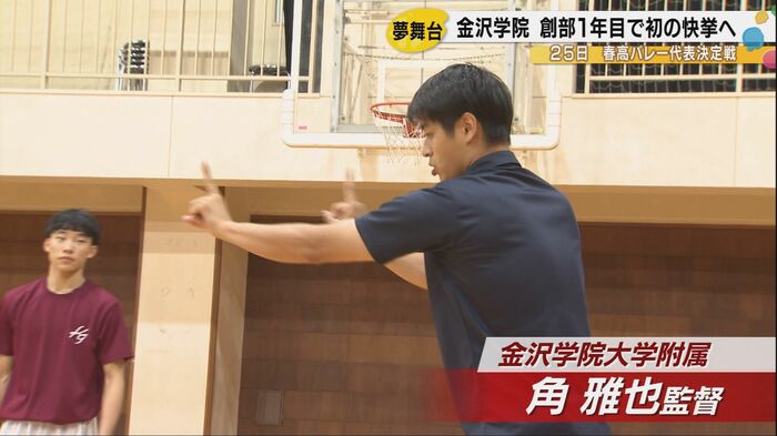 その小松大谷高校に挑むのは金沢学院大学附属高校だ。創部1年目ながら、決定戦に駒を進めた。チームの中心は、キャプテンの川口泰誠選手と竹田蓮選手だ。両レフト中心のシンプルな攻撃ながら、高い攻撃力で県内の強豪たちに打ち勝ってきた。そんな金沢学院を率いる角雅也監督はVリーグのVC長野トライデンツで守備の要、リベロとしてプレーしていた元プロ選手だ。レシーブの指導には熱が入る。