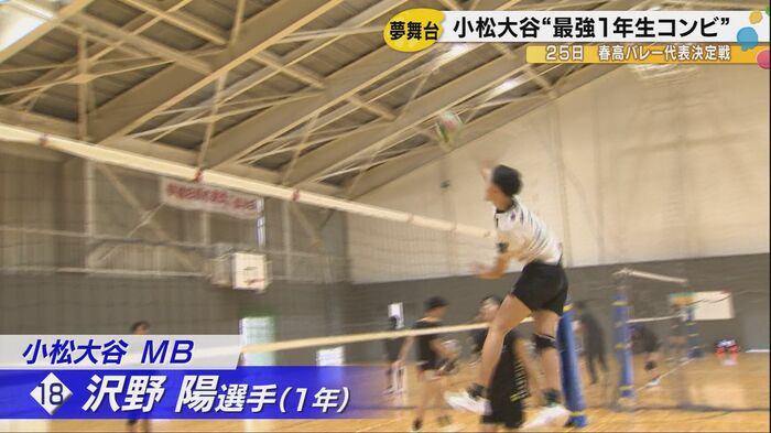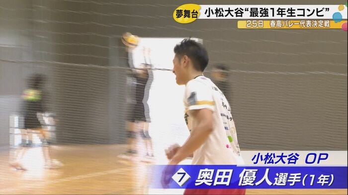 王者・小松大谷は4年連続5回目の春高、全国出場を目指す。一度の攻撃にスパイカーが何人も絡むコンビ攻撃が小松大谷の伝統だ。今年はそこに新たなエッセンスが加わった。出島蓮主将は「コンビを使って困ったらエースにあげるバレー」と話す。エースはサウスポーの奥田優人選手。1年生で身長185センチ、最高到達点336センチの高さを生かした強烈なスパイクと勝負強さでチームをけん引する。
