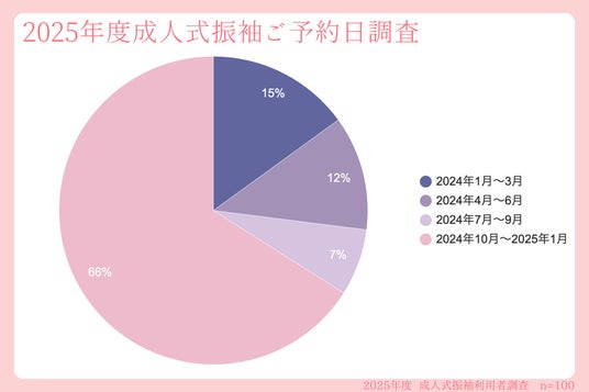 2025年成人式 振袖のご注文月別割合。2024年1月~3月のご予約が15%、4月~6月のご予約が12%、7月~9月のご予約が7%、10月~翌年1月のご予約が66%という内訳になった。