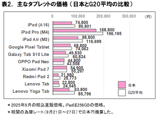 タブレット端末について見ると、iPadの日本での価格は74,800円(G20平均-13.8%)、iPad Proは168,800円(G20平均-14.0%)、iPad Airは98,800円(G20平均-15.3%)であり、G20平均と比べて15%前後安い。また、Google Pixel Tabletの日本での価格は68,800円(G20平均-7.1%)、Galaxy Tab S10 Liteは49,830円(G20平均-18.1%)となっている。