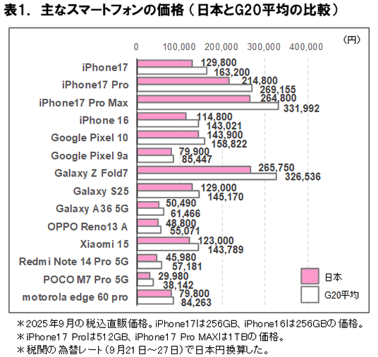 調査の結果、日本における9月時点のスマートフォン端末の価格は、iPhone17が129,800円(G20平均-20.5%)、iPhone16が114,800円(G20平均-19.7%)、Google Pixel10が143,900円(G20平均-9.4%)であった。iPhoneの日本での価格は、G20平均と比べて20%前後安く、Google PixelはG20平均と比べて8%前後安い。