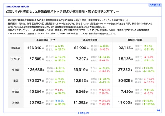 日本最大級の商業用不動産データ分析基盤「estie マーケット調査」を中心に複数のサービスを提供する株式会社estie(本社:東京都港区、代表取締役:平井 瑛、以下「estie」)は、「estie マーケット調査」による分析データをまとめた最新不動産マーケット動向レポート「エスティ マーケットレポート」2025年10月号を配信開始しました。