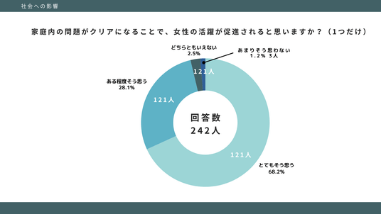 一方で、家庭の問題が解消されることで「女性の活躍が促進されると思う」と回答した人は96.3%という回答結果が得られました。